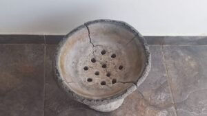 Raque moldeó el cenicero que tiene forma de copa cónica y va en la parte de abajo; con un cuchillo le marcó una ventana; así, cuando estuviera en su trajín laboral, los pulmones de carbón recibirían el aire que mantiene la llama prendida. Con cuchara de calabazo a modo de espátula, le retiró los residuos de barro; usó las yemas de los dedos por fresadora para terminar de pulir las geometrías internas hasta darle forma a la hornilla y luego se dedicó a esculpir el binde, al que, sirviéndose de las brocas naturales que tiene en sus manos, le hizo en el fondo once ojos que han llorado durante más de diez años las cenizas desprendidas de los tizones avergonzados por el fuego. Terminadas de moldear, sentó el binde sobre el cenicero; tomó la espátula de totumo y con una investidura de cirujana estética, valiéndose de barro fresco como pegante, pulió y pulió hasta hacer desaparecer el rastro de la unión. Dejó así listas, en una sola pieza, las dos partes que con esta arquitectura empírica evitaron la emisión de humo y redujeron el consumo de carbón. Mañana, muy temprano, lo bruñirá con una piedra que acompasada al vaivén de sus manos hará las veces de pulidora y lo dejará vestido de gala para asistir a la fiesta ardiente que disfrutará sobre un tendido de leña. Será ese el remate de su fabricación.